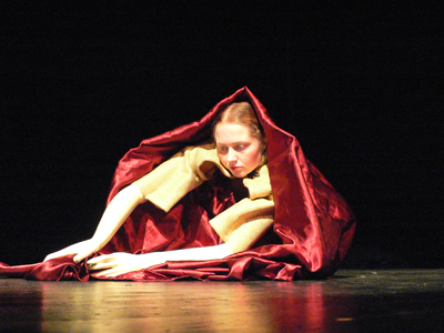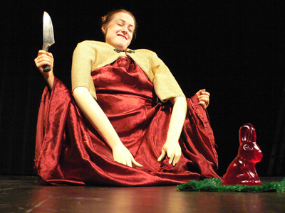 Eine Königin allein in ihrem winzigen Reich. Die einzigen Spielgefährten sind zwei stumme Hasen. Doch in ihrer mächtigen roten Robe stecken zwei Hände voll Eigenleben... und sind der Königin nicht immer zu Diensten. Mordlüstern und Küsse werfend durchschreitet diese Herrscherin das Königreich ihrer Launen. Ein grotesker Tanz für eine Spielerin, vier Hände und zwei aufopferungsvolle Gelatinehäschen.